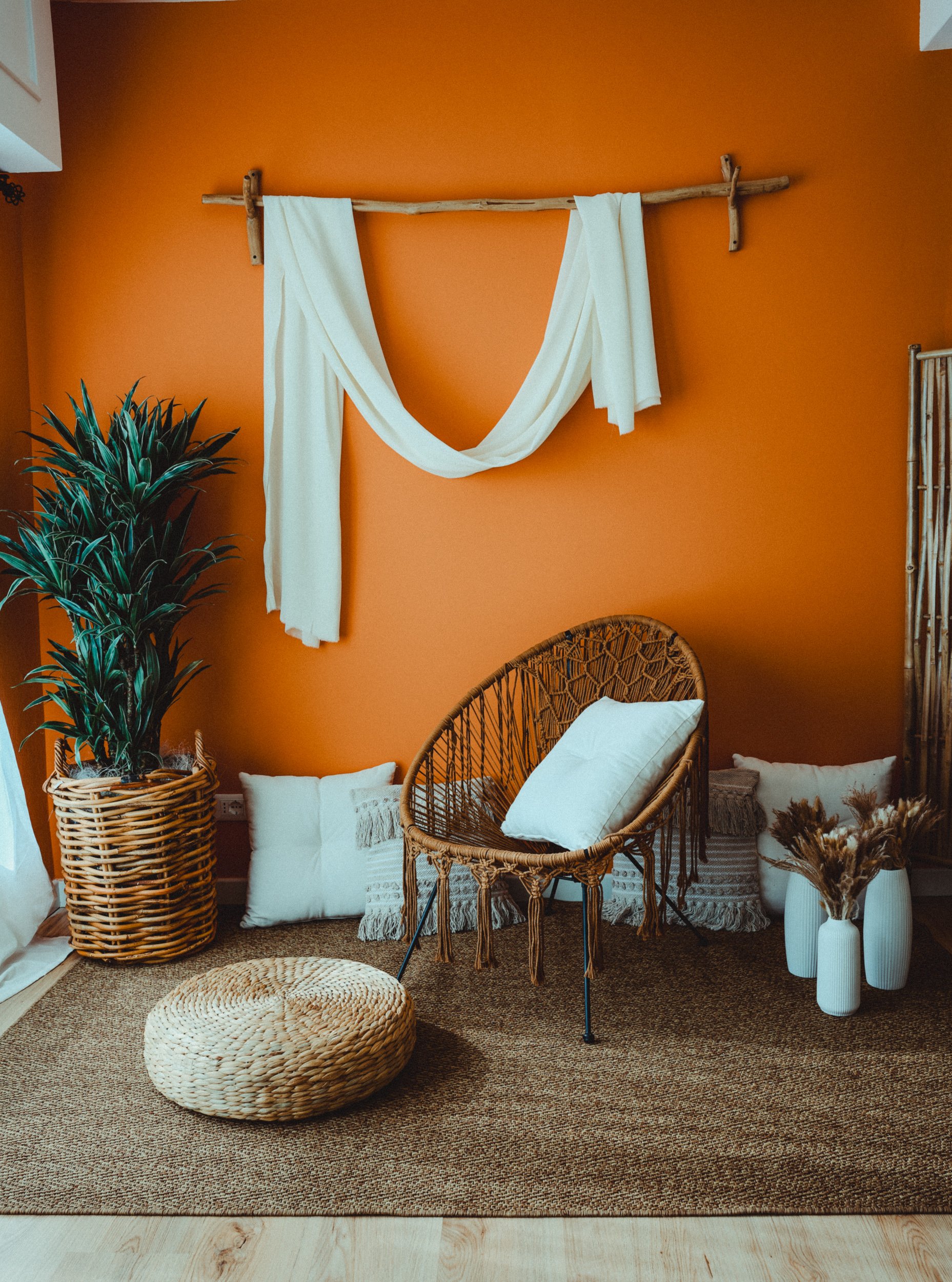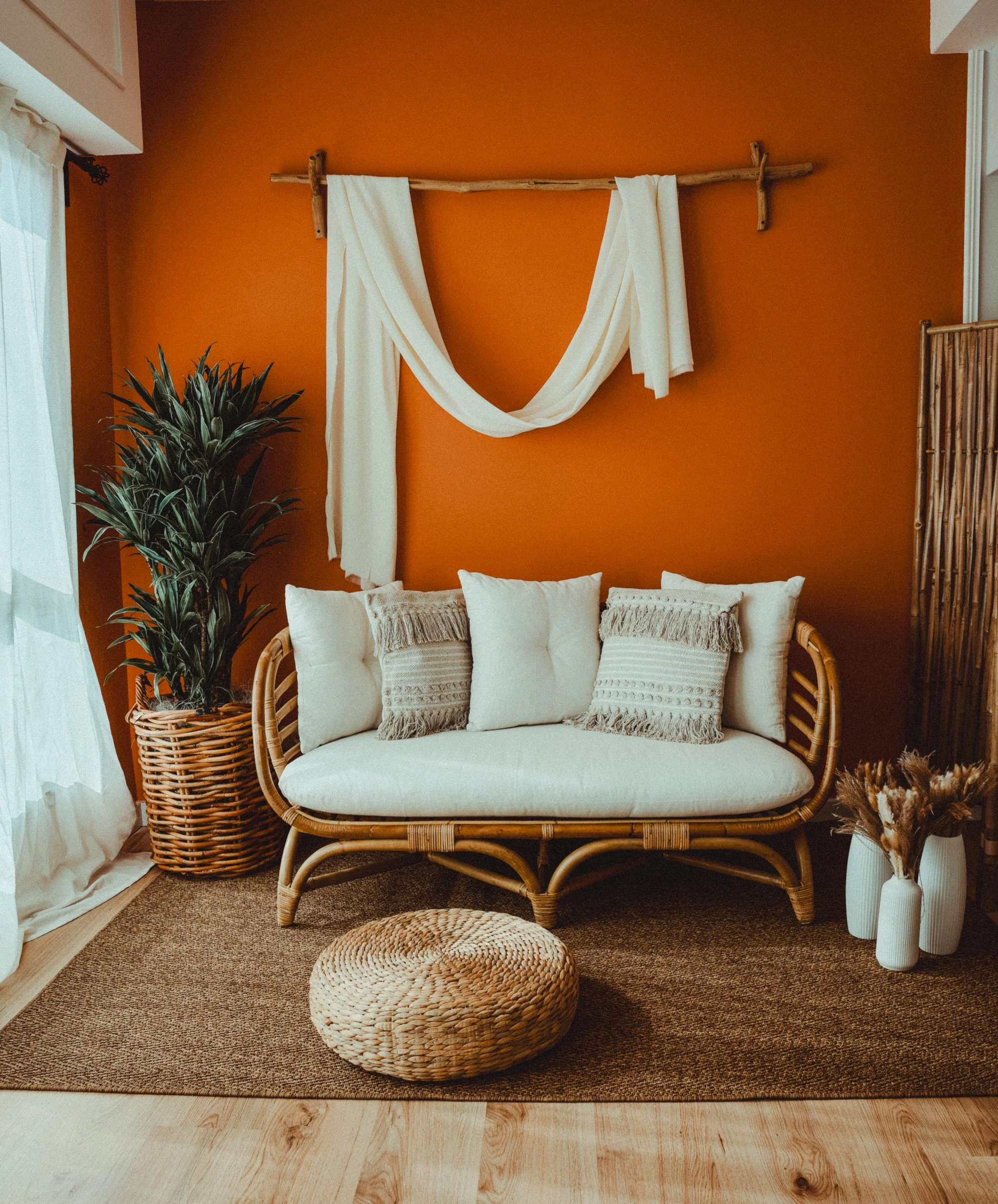 La parete color terracotta avvolge la scena con una tonalità intensa e raffinata che dona profondità alle fotografie e valorizza i toni della pelle. Il divanetto in rattan naturale, con i suoi cuscini morbidi e dalle tonalità neutre, crea uno spazio semplice e armonioso dove sentirsi subito a proprio agio.