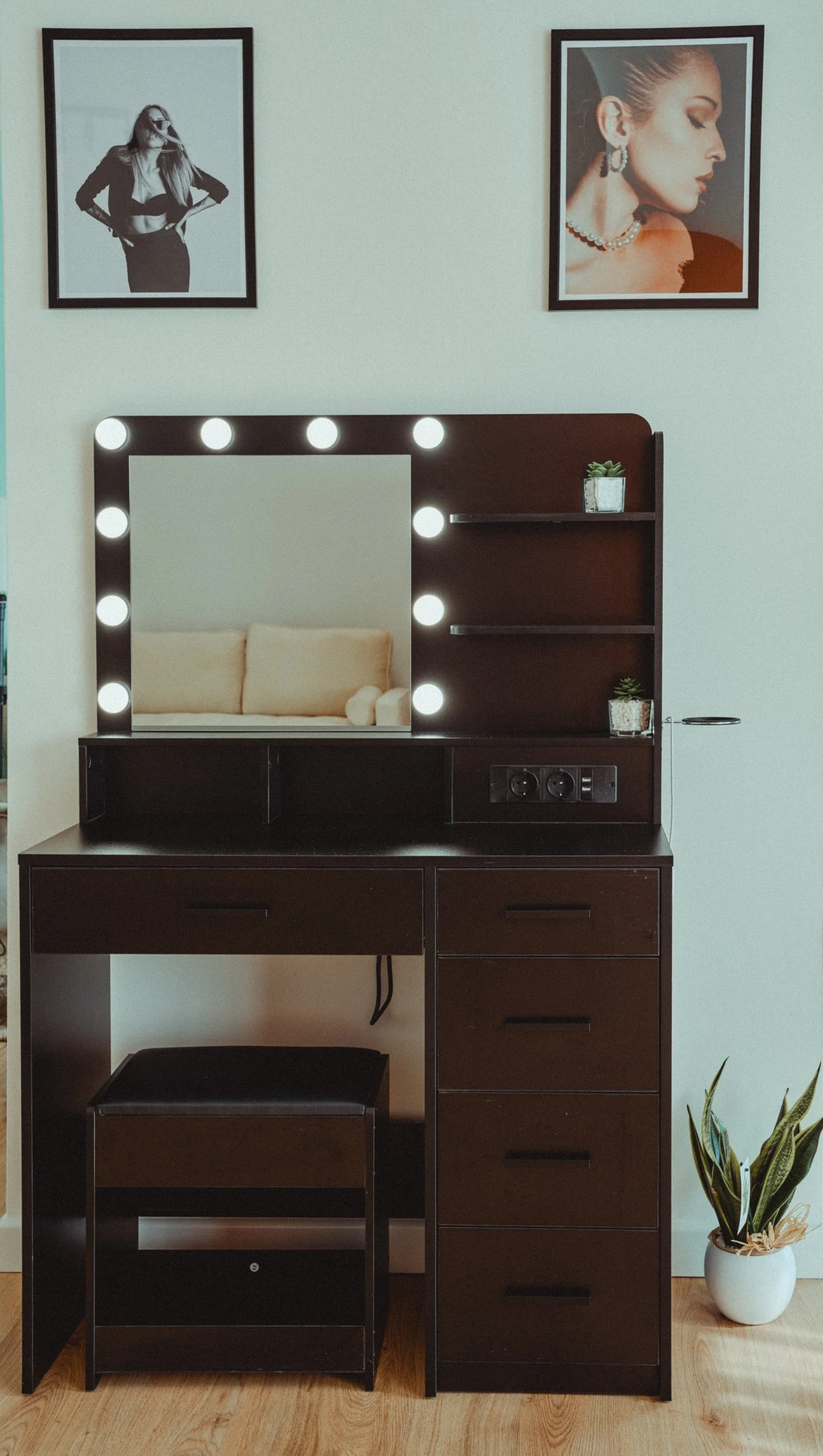Lo specchio illuminato con luci da camerino permette alla truccatrice di lavorare con precisione, creando un makeup naturale ed elegante che risulti perfetto anche in fotografia. È uno spazio comodo e tranquillo dove prendersi qualche momento per sé prima di iniziare lo shooting.